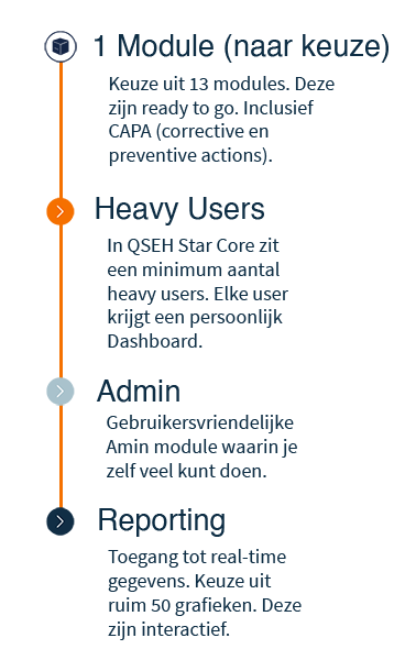 QSEH Star biedt een schaalbare, flexibele oplossing die meegroeit met je organisatie. Of het nu gaat om extra gebruikers, nieuwe modules, integraties, of maatwerk—alles is mogelijk.